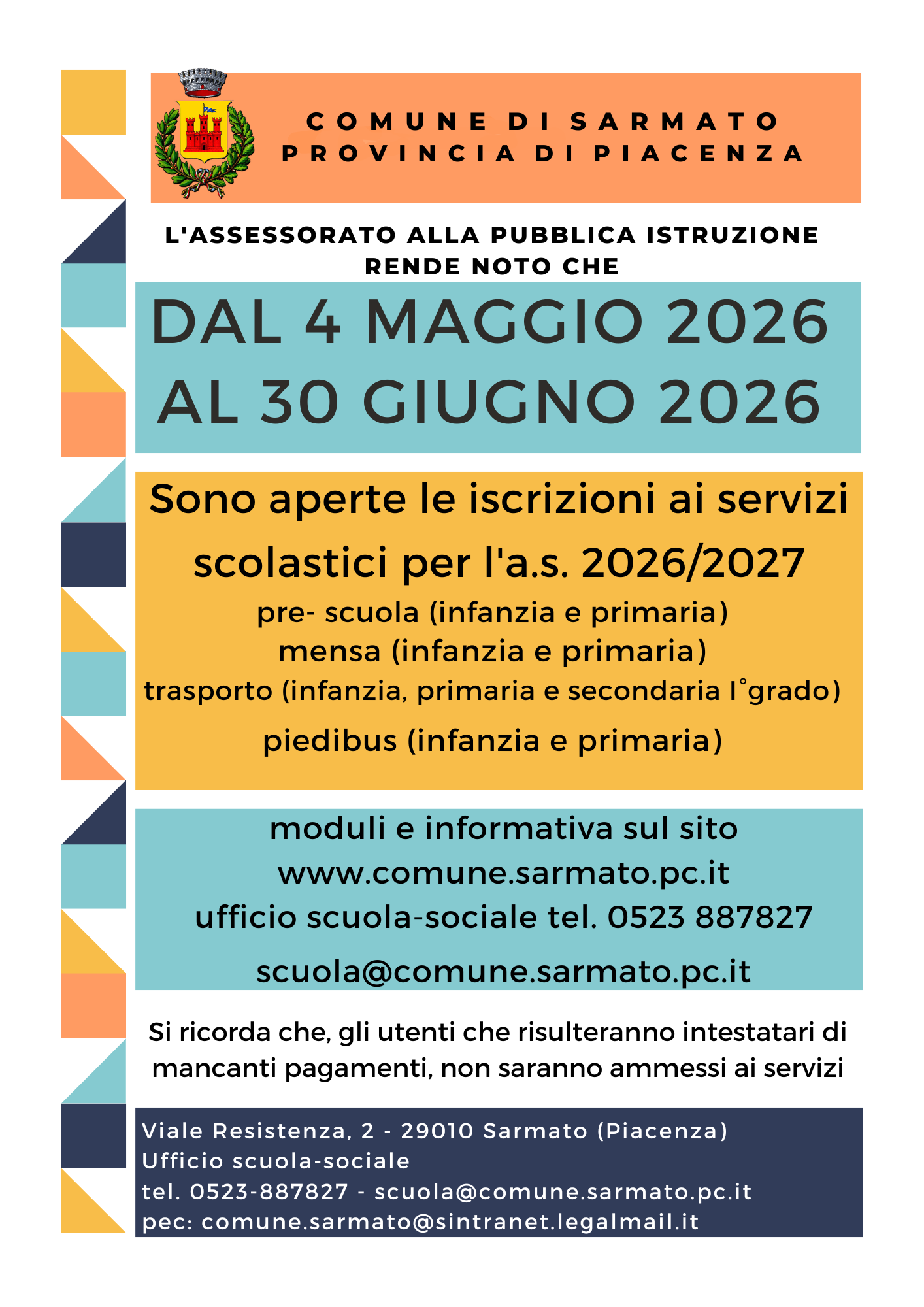 *Si segnala che l’ufficio scuola-sociale resterà chiuso nei giorni del 14 e 15 maggio 2026 ed il 1 giugno 2026.