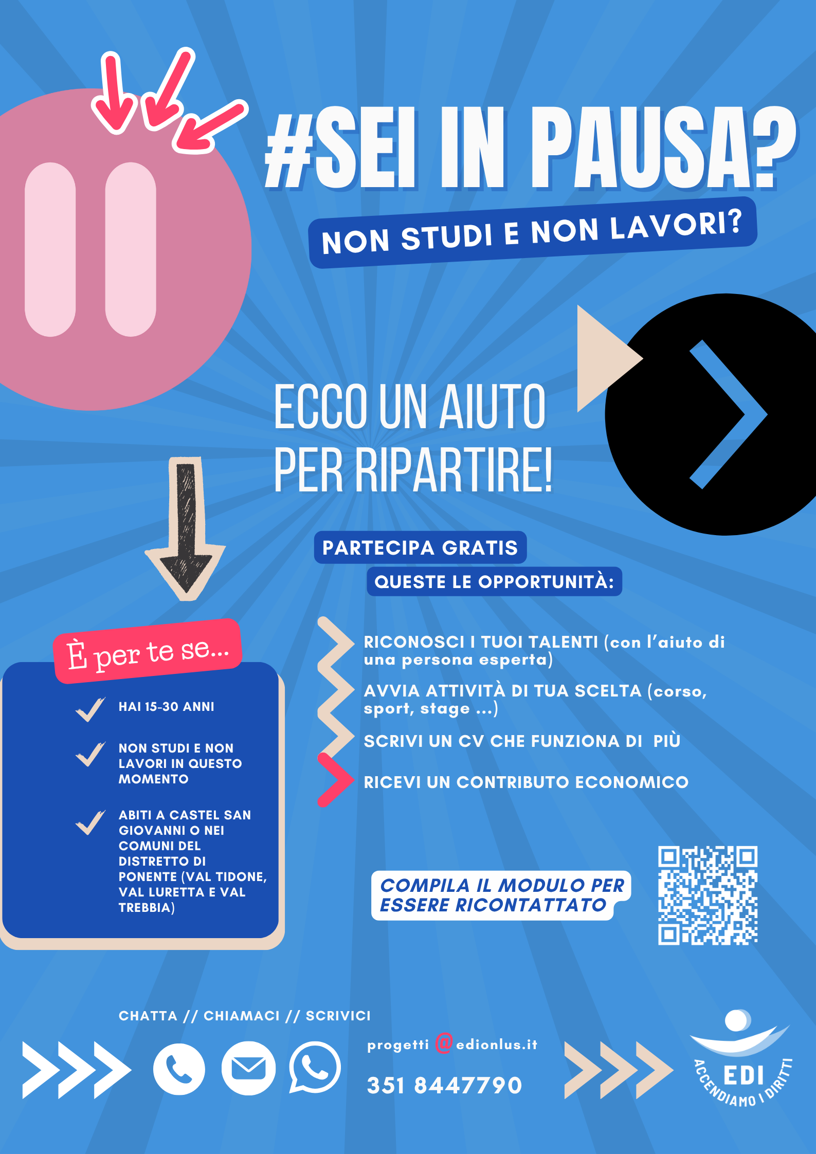 Per aderire all'iniziativa e ricevere aiuto per ripartire, i giovani interessati sono invitati a compilare l'apposito modulo disponibile QUI (https://shorturl.at/ohPL1) o a contattarci direttamente all’indirizzo: progetti@edionlus.it